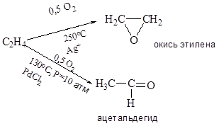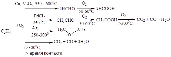 Требования на сырье: высокая концентрация, осушка, очистка от примесей, интервалы вне пределов взрываемости (3-30% по С2Н4; 3-80% по оксидам). Конверсия низкая, проблема с выделением товарных продуктов.
