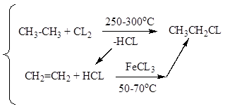Т = 250-300oC; хлорирование в объеме или с использованием насадки. Механизм цепной радикальный; инициирование термическое; УФ – облучение, вещественное, индуцированное хлорирования СnH2n+2, где (n> 10).