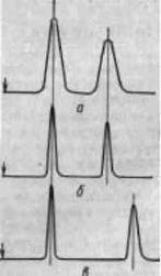 Примем условие, что какие-то два компонента растворимы в подвижной фазе и взаимодействуют с неподвижной фазой, т.е. хроматографический процесс может протекать без нарушений. В этом случае после прохождения смеси через колонку можно получить хроматограммы вида а, б или в (рис. 1.1). Эти хроматограммы иллюстрируют хроматографические разделения, отличающиеся эффективностью (а и б) при равной селективности и селективностью (б и в) при равной эффективности.
