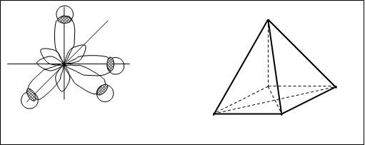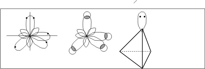 В данном преобразовании учавствуют одно s-облако и три р-облака, поэтому такая перестройка называется sp3-гибридизацией. Как видно из рис.4.12. в результате гибридизации не только изменяется форма облаков, изменяется также взаимное расположение облаков, увеличиваются углы между новыми (гибридными) орбиталями. Гибридное состояние атома приобретает своеобразную геометрическую конфигурацию, которая и предопределяет геометрическую структуру молекулы.