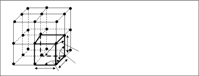 Каждый маленький объем жирный кубик на рис.5.1., являющийся наименьшим объемом кристалла, назван элементарной ячейкой кристалла. Элементарная ячейка любой формы кристалла содержит определенное число частиц вещества и характеризуется параметром ячейки – длиной ребра (а, б, в) и значениями углов между ними (a, b, g).