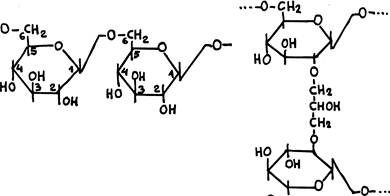 На рис. 55 слева показана связь между двумя соседними молекулами глюкозы. Как это уже было принято для Сахаров нуклеиновых кислот, в углах шестиугольника, обозначенных цифрами 1—5 следует подразумевать атомы углерода, а на открытых концах вертикальных черточек — атомы водорода. Связь осуществляется через атом кислорода между углеродами в позициях 1 и 6.