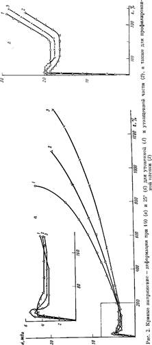 Прочность о профилированной пленки выше, чем ее утолщенной части, но ниже по сравнению с утоненной (табл. 1). По-видимому, в данном случае заметно не сказывается влияние масштабного фактора на изменение разрывной прочности, как указано в работе [7]. Различие в свойствах ориентированной при 140° профилированной пленки и ее составных частей при исследуемой температуре испытания (25°) также связано в определенной степени с перераспределением массы полимера по объему, как и при изучении зависимости напряжение — деформация для неориентированной пленки. Вследствие этого профилированная пленка имеет более высокое значение разрывного удлинения е по сравнению с ее составляющими (табл. 1). Необходимо отметить, что относительное перераспределение массы полимера в ориентированной пленке при 25° проявляется заметнее, чем при деформации неориентированного материала при данной температуре. Это, по-видимому, связано со структурными особенностями ориентированного и неориентированного полимерного материала, влияющими на его деформацию.