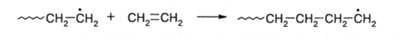 Цепная полимеризация осуществляется путем последовательного присоединения к растущим цепям с активными центрами на конце мономеров в результате раскрытия содержащихся в них ненасыщенных связей или циклов. Характерным признаком цепной полимеризации является очень короткое время жизни (меньше секунды) растущей цепи, несущей активный центр, и невозможность выделить ее в неизменном состоянии. Активным центром в цепной полимеризации может быть радикал, катион или анион, в соответствии с чем различают радикальную, катионную и анионную полимеризации. Ниже приведена реакция присоединения этилена к растущей цепи, несущей на конце свободный радикал: