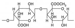 Прочность стволов и стеблей растений, помимо скелета из целлюлозных волокон, определяется соединительной растительной тканью. Значительную ее часть в деревьях составляет лигнин - до 30 %. Его строение точно не установлено. Известно, что это относительно низкомолекулярный (М ~ 104) сверхразветвленный полимер, образованный в основном из остатков фенолов, замещенных в орто-положении группами -ОСН3, в пара-положении группами -СН=СН-СН2ОН. В настоящее время накоплено громадное количество лигнинов как отходов целлюлозно-гидролизной промышленности, но проблема их утилизации не решена. К опорным элементам растительной ткани относятся пектиновые вещества и, в частности пектин, находящийся в основном в стенках клеток. Его содержание в кожуре яблок и белой части кожуры цитрусовых доходит до 30%. Пектин относится к гетерополисахаридам, т.е. сополимерам. Его макромолекулы в основном построены из остатков D-галактуроновой кислоты и ее метилового эфира, связанных a-1,4-гликозидными связями: