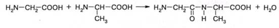 В табл. 1.2 представлены важнейшие аминокислоты, образующие белки. Остатки аминокислот связаны в макромолекулы белка пептидными связями, возникающими в результате реакции карбоксильных и аминогрупп. Ниже эта реакция приведена для двух аминокислот - глицина и аланина: