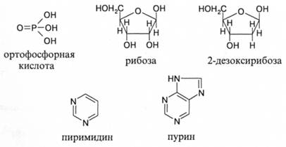 Как уже упоминалось выше, звенья нуклеиновых кислот, называемые нуклеотидами, содержат остатки фосфорной кислоты, сахара и оснований. Образование цепи из нуклеотидов происходит в результате катализируемой ферментами конденсации групп -ОН остатков сахара и фосфорной кислоты. В результате макромолекулы всех нуклеиновых кислот имеют цепи с регулярным чередованием остатков сахара и фосфорной кислоты, что схематически может быть представлено следующим образом: