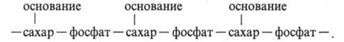 Из этого примера видно, что основная цепь нуклеиновых кислот образуется в результате конденсации гидроксильных групп, связанных с 3'- и 5'-атомами углерода сахара рибозы в РНК (представлено на схеме) и дезоксирибозы в ДНК - с группами ОН фосфорной кислоты. Основание во всех случаях присоединено к 1'-атому сахара. Одна из групп ОН фосфорной кислоты не участвует в реакции поликонденсации. Для дважды этерифицированной фосфорной группы найдено pK = 1,5, следовательно, нуклеиновые кислоты, содержащие несвязанные P-OH-группы, могут быть отнесены к достаточно сильным кислотам.