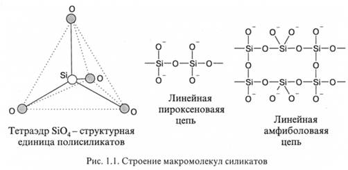 На рис. 1.1 представлены также фрагменты макромолекул линейных и двухмерно сшитых линейных двухтяжевых полисиликатов. Такие структуры могут быть получены при сочетании тетраэдров SiO2 вершинами, при этом, ионам кислорода должны соответствовать свободные вершины. Слоистые структуры SiO4 образуются при сочетании тетраэдров ребрами, при этом один атом кислорода должен оставаться свободным. Линейные макромолекулы SiO2 входят в состав минералов пироксен, энстатит, диопсид, сподумен, амфиболит, тремолит и др. Последние составляют основу природного волокнистого неорганического материала, известного как асбест. В состав многих минералов входят слоистые полимерные структуры SiO2, например в состав талька и каолинита (белой глины), где они чередуются со слоями полимерных гидроксида магния - в первом случае и гидроксида алюминия - во втором.
