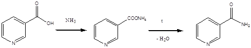 Экономичный способ синтеза никотинамида основан на пропускании газообразного аммиака через смесь никотиновой кислоты и водного раствора аммиака при 180-185°С: