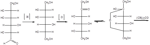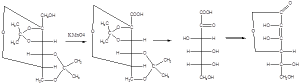 Промышленный способ получения кислоты аскорбиновой основан на синтезе D-глюкозы, которую восстанавливают в D-сорбит каталитическим гидрированием. Важным этапом синтеза является процесс глубинного бактериохимического окисления _брожжения) с помощью Acetobacter suboxydans D- сорбита до L-сорбозы. Последнюю подвергают ацетонированию и полученную диацетон-L-сорбозу окисляют до диацетонкетогулоновой кислоты. Затем осуществляют процесс омыления и лактонизацию 2-кето-L-гулоновой кислоты до: