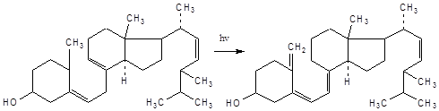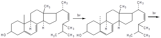 Механизм образования кальциферолов основан на фотохимической реакции, которой подвергают природные стерины (эргостерин, холестерин и др.). При ультрафиолетовом облучении (фотолизе) эргосерина образуется ряд продуктов, в том числе эргоальциферол:
