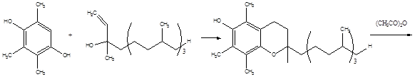 В качестве ЛС применяют α-токоферола ацетат. Синтезируют его конденсацией триметилгидрохинона и изофитола с последующим ацетилированием уксусным ангидридом образовавшегося α-токоферола: