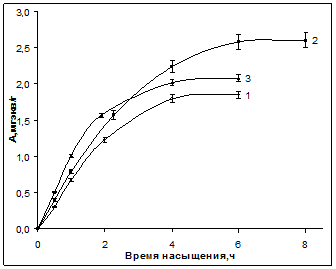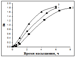 Рис.7. Кинетические кривые сорбции палладия на волокнах ЦМ-А2(1), Мтилон-Т(2) и ВАГ(3)