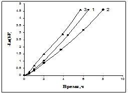 Рис.9. Кривая зависимости Ln(1-F) от времени для волокон ЦМ-А2(1), Мтилон-Т(2) и ВАГ(3)