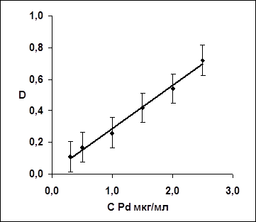Сорбцию проводили в статических условиях при температуре 20±1°С, масса волокна составила 0,100±0,002г. рН составляла 1,0±0,1. Концентрация палладия от 0,2 до 3 мг/мл. Концентрацию палладия определяли по методике 2.2.1. Объем составлял 20 мл. Сорбцию определяли по отношению количества палладия до и после сорбции (Приложение 2).