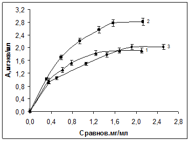 Рис.3. Изотерма сорбции палладия на волокне ЦМ-А2 при 20(1), 45(2) и 60ºС(3)