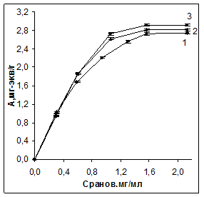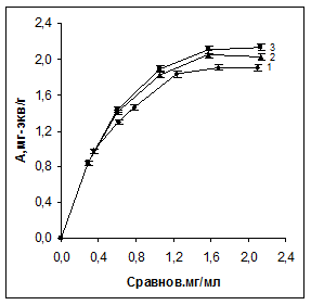 Рис.5. Изотерма сорбции палладия на волокне ВАГ при 20(1), 45(2) и 60ºС(3)