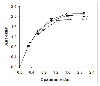 Рис.4. Изотерма сорбции палладия на волокне Мтилон-Т при 20(1), 45(2) и 60ºС(3)