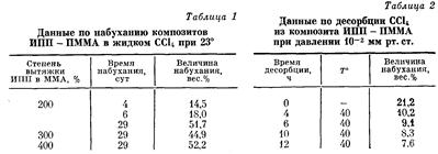 Не менее необычным оказывается поведение композитов и при десорбции СС14. При уменьшении давления паров образцы чистого ИПП обнаруживают обратимое изменение сорбции, и при вакуумировании они полностью теряют весь сорбированный СС14. В то же время в случае композитов ИПП — ПММА выдерживание образцов, просорбировавших при давлении пара 0,7, при давлении 0,6 в течение 2 сут не приводит к уменьшению сорбции, которое можно было бы обнаружить с помощью весов Мак-Бена. Выдерживание этого же образца на воздухе в течение 20 сут при комнатной температуре также не вызывает заметной десорбции СС14. Результаты дальнейших экспериментов по десорбции из композита ИПП — ПММА, содержавшего в исходном состоянии 21,2% СС14, представлены в табл. 2. Хорошо видно, что только совместным действием вакуума 10-2 мм рт. ст. и повышением температуры от комнатной (23°) до 40° удается вызвать частичную десорбцию СС14.