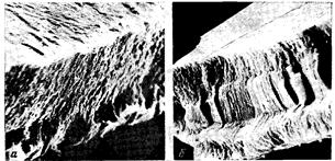 Можно предположить, что столь большое поглощение СС14 связано с некоторыми структурными перестройками в композите. Поэтому были предприняты микроскопические исследования образцов композитов ИПП— ПММА до и после воздействия на них СС14. Из рис. 4, а хорошо видно, что исходный образец достаточно однороден вдоль всего поперечного сечения. В то же время при взаимодействии композита с СС14 наблюдаются заметные структурные перестройки (рис. 4, б). С обеих поверхностей, т. е. там, где композит взаимодействовал с СС14, его структура выглядит более рыхлой, чем плотная сердцевина. Между рыхлой оболочкой и плотной сердцевиной имеется очень резкая граница. Свойства сердцевины и оболочки различаются столь сильно, что при получении хрупких сколов материал разрушается с образованием характерных ступенек, возникающих на их поверхностях раздела.