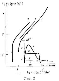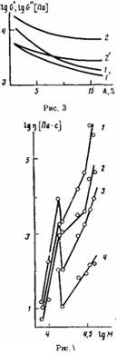 Главной особенностью рисунка является несовпадение положения кривых течения, определенных при использовании разных схем сдвигового деформирования. В этих условиях максимальными оказываются значения комплексной динамической вязкости (кривая 1), а минимальными — величины вязкости, определенные на ротационном приборе в режиме стационарного сдвига (кривые 3 и 4). Зависимость lgY(lgx), измеренная на капиллярном вискозиметре (кривая 2), занимает промежуточное положение.