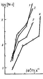Рис. 5. Температурная зависимость вязкости расплавов ПЭФ-10 с Л/-10-' = 4.18 (1), 3,16 (2), 1,58 (3) и 0,8 (4)