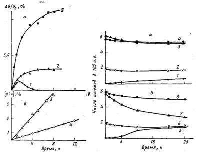 Из данных проведенного хроматографического анализа следует, что в описываемых условиях выделяются два химически различных соединения. Анализ продуктов пиролиза показал, что их основную часть составляет синильная кислота, представленные на рис. 1, б кривые демонстрируют практически линейную зависимость количества HGN от времени. Как видно из сопоставления кривых на рис. 1, а и б, потери веса происходят не только вследствие выделения HGN. Результаты анализа элементного состава ПАН в ходе процесса (рис. 2, а и б) показывают, что с наибольшей скоростью уменьшается содержание атомов водорода в полимере. При этом разный наклон кривых 1 и 4 (рис. 1,а и б) означает, что водород выделяется не только в виде HCN. За любой выбранный промежуток времени величина АН/АО»2 (где АН и АО — изменение содержания водорода и кислорода соответственно), т. е. один атом кислорода обменивается на два атома водорода, что указывает на выделение Н20. Количество Н20 было вычислено на основании кривых изменения элементного состава по уменьшению содержания водорода с поправкой на выделение водорода в виде HCN. Таким образом, водород участвует в двух реакциях — выделения HCN и Н20.