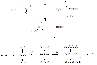 Вторая аминокислота В (аминокомпонент) атакует активированный карбоксильный компонент аминогруппой с образованием пептидной связи. Незащищенная аминофункция карбоксильного компонента А тоже может реагировать, что приводит (рис. 5) к нежелательным побочным продуктам — линейным и циклическим пептидам. Из этого следует вывод, что для однозначного течения пептидного синтеза следует временно блокировать все функциональные группы, не участвующие в образовании пептидной связи[3].