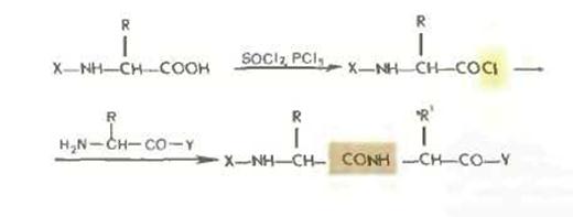 Хлорангидридный метод, упоминавшийся в историческом очерке, в настоящее время применяется редко, так как сопровождается рацемизацией и образованием побочных продуктов. Хлорангидриды получаются обычно обработкой производных аминокислот и пептидов хлористым тионилом или пятихлористым фосфором.