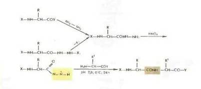 Гидразиды получаются либо прямым гндразинолизом эфиров защищенных аминокислот или пептидов, либо из защищенных гидразидов (—СО— NH — NH— Z—, - СО—NH и т. д.). Перевод в азиды осуществляется обработкой водным раствором нитрита натрия в кислой среде при —5 °С или действием изоамилнитрита или третбутил нитрита при —20 0 С в органическом растворителе (модификация Хонцля и Рудингера 1961). Азиды можно получать и непосредственно из НООС-производных с помощью днфенилфосфорилазида N3PO(OC2H5)z. применяемого в качестве конденсирующего агента (в частности, для получения циклопептидов).