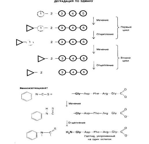От пептидной цепи отщепляют меченый N-концевой остаток аминокислоты (ФТГ-аланин на первой ступени деградации). Остаток пептидной цепи при этом не гидролизуется. На второй ступени деградации определяют следующий N-концевой аминокислотный остаток. Еще три ступени деградации но Эдману позволят установить всю последовательность аминокислот во взятом пептиде.