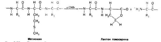Стратегию анализа последовательности аминокислот в белках можно определить как «разделяй и властвуй». Белок подвергают специфическому расщеплению па более короткие пептиды, последовательность аминокислот в которых определяют по Эдману. Специфическое расщепление можно производить химическими или ферментативным методами. Так, Б. Уиткоп (В. Witkop) и Э. Гросс (Е. Gross) обнаружили, что бромистый циан (CNBr) расщепляет полипептидную цепь только по пептидной связи, образованной карбоксильной группой остатка метионина, Если в белке содержится 10 метиониновых остатков, то после обработки бромистым цианом обычно получается 11 пептидов. Высокоспецифическое расщепление достигается также с помощью трипсина-протеолитического фермента поджелудочной железы.