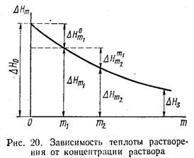 Теплота растворения зависит от концентрации химического соединения в растворе. Теплота, которая поглощается или выделяется при растворении одного моля вещества в таком количестве растворителя, чтобы образовался раствор с определенной моляльностыо т, называется интегральной теплотой растворения.