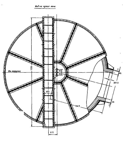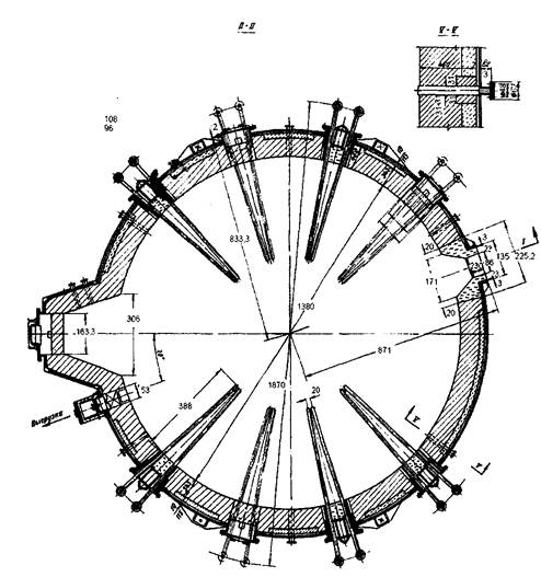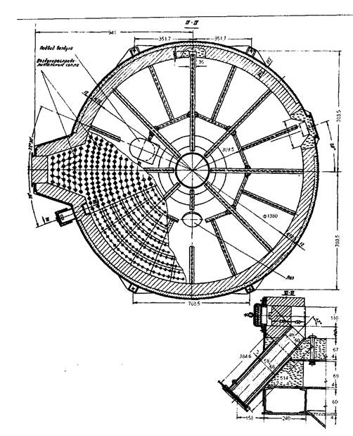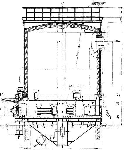 Как показали расчеты площадь пода равна 1,5м2. Для расчета печи с такой площадью пода нужна спец литература. Целью данной работы не является данный расчет, и рисунок 1., представленный ниже, является приблизительной копией нужной печи кипящего слоя. Рисунок 1. Печь кипящего слоя [4].