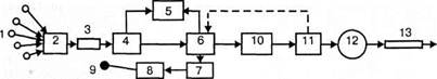 1—скважины, 2 — групповая замерная установка, 3 — коллектор, 4 — дожимная насосная станция, 5 — газоперерабатывающий завод, 6 — установка подготовки нефти, 7 — установка очистки воды, 1 — насосы, 9 — нагнетательные скважины, 10 — герметизированные резервуары, 11 — установка «Рубин», 12 — товарные резервуары, 13 – магистральный нефтепровод.