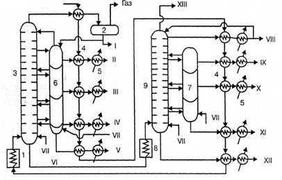 1 —трубчатая печь подогрева нефти, 2 — сепаратор газа, 3 — ректификационная колонна атмосферного давления, 4 — теплообменники-конденсаторы, 5 — холодильники, 6,7 — отпарные колонны, 1 — трубчатая печь подогрева мазута, 9-—вакуумная ректификационная колонна. I — бензин, II — лигроин, III — керосин, IV — дизельное топливо, V — газойль, VI — мазут, VII — пар, VIII — веретенное масло, IX — машинное масло, X — легкое цилиндровое масло, XI — тяжелое цилиндровое масло, XII — гудрон, XIII — газы