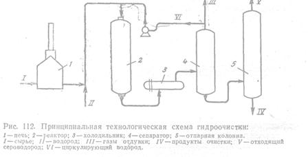 Гидроочистка— одноступенчатый процесс, проходящий в наиболее мягких, по сравнению с гидрокрекингом и деструктивной гидрогенизацией, условиях. Процесс протекает при 380—430 °С, 30—66 ат, циркуляции водородсодержащего газа 100—600 м3/м3 сырья и объемной скорости 3—10ч-1 с применением катализатора (обычно алюмокобальтмолибденовый или алюмоникельмолибденовый). Гидроочистке (или гидрооблагораживанию) может подвергаться различное сырье, получаемое как при первичной перегонке нефти, так и при термокаталитических процессах, от газа до масел и парафина. Наибольшее применение гидроочистка имеет для обессеривания сырья каталитического риформинга, а также для получения реактивного и малосернистого дизельного топлива из сернистых и высокосернистых нефтей. При гидроочистке происходит частичная деструкция в основном сероорганических и частично кислородных и азотистых соединений. Продукты разложения насыщаются водородом с образованием сероводорода, воды, аммиака и предельных или ароматических углеводородов.