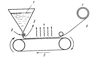 / — раствор полимера; 2 — распределительный клапан; 3 — раствор полимера растекается с образованием пленки; 4 — растворитель испаряется; 5 — бесконечный металлический пояс; 6 — непрерывная полимерная пленка; 7 — сматывающая катушка