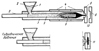 6 — подвижная часть формы; 7 — основной цилиндр; 8 - торпеда; 9 - размягченный пластический материал; 10 — пресс-форма; 11 - изделие, сформованное методом литья под давлением