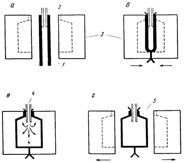 в — вдувание воздуха в пресс-форму; г — открывание пресс-формы. 1— заготовка;