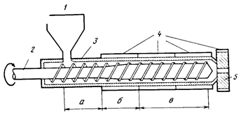 1 — загрузочная воронка; 2 - шнек; 3 - основной цилиндр; 4 — нагревательные элементы; 5 — выходное отверстие головки экструдера, а — зона загрузки; б — зона сжатия; в ~ зона гомогенизации