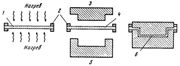 1 — лист термопластического материала; 2 — зажим; 3 — пуансон; 4 — размягченный нагревом лист; 5 — матрица; 6 — изделие, полученное методом формования листовых термопдастов