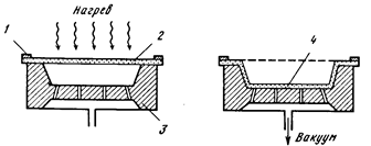 1 — зажим; 2 — лист термопласта; 3 — пресс-форма; 4 — изделие, полученное методом вакуумного формования термопластов