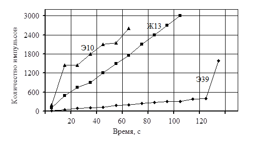 Импульсное электромагнитное излучение наблюдается у композиционных материалов всех рассматриваемых в работе видов практически от начала нагружения. Типичные кинетические кривые накопления числа импульсов для фенопластов приведены на рисунке. Простейший качественный анализ кинетических кривых показывает, что образцы фенопластов ведут себя по-разному .