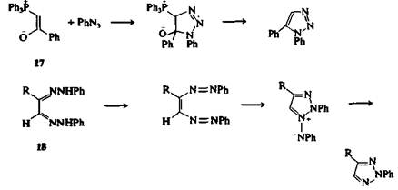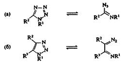 Некоторые 1,2,3-триазолы и тетразолы достаточно легко раскрываются при нагревании. Кольчато-цепиая таутомерия довольно обычна для 1,5-дизамещенных 1Н-тетразолов (рис. 2, а), а также наблюдается, но реже, для 1-замещенных 1,2,3-триазолов (рис. 2, б). Раскрытие цикла облегчается наличием электроноак-цепторных групп в положении 1; например, 1-циано-1,2,3-триазол, в противоположность большинству 1,2,3-триазолов, существует в растворе в равновесии с его диазоиминной таутомерной формой.