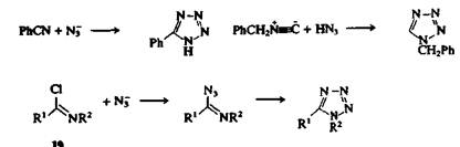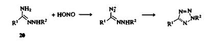 в) превращение имидоил-хлоридов 19 в 1,5-дизамещеиные тетразолы взаимодействием с НЫз или азидом натрия. 2,5-Дизамещенные тетразолы могут быть получены другим способом — реакцией амидразонов 20 с азотистой кислотой.