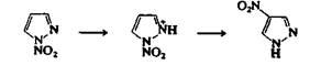 Химические свойства этих азолов отличаются от свойств пиррола тем значительнее, чем больше число атомов азота в молекуле. Для этих циклических систем относительно редки реакции злектро-фильного замещения по атому углерода, так как атомов углерода в молекуле меньше, и злектрофилы преимущественно атакуют атомы азота. Пиразолы можно хлорировать и бромировать в мягких условиях по положению 4. 4-Нитропиразол можно получить непрямым синтезом из пиразола: при взаимодействии с ацетатом нитро-ния (N02"tAc-) образуется 1-нитропиразол (21), который при обработке серной кислотой превращается в 4-нитропиразол. Эта реакция, по-видимому, протекает с переносом группы N02+ через стадию образования промежуточного катиона 22, так как было показано, что 1-нитропиразол можно использовать как удобный и эффективный нитрующий агент для ароматических углеводородов в присутствии кислот. 1,2,3-Триазол может быть превращен в 4,5-дибромопроизводное реакцией с гипобромитом натрия в уксусной кислоте, а 1,2,4-триазол можно прохлорировать по положению 3, причем реакция идет через образование 1-хлоропроизводиого, которое может быть выделено. Таким образом, для этих циклических систем возможно электрофильное замещение по атому углерода, но процесс идет через образование интермедиата, получаемого в результате первоначальной атаки электрофилом атома азота.
