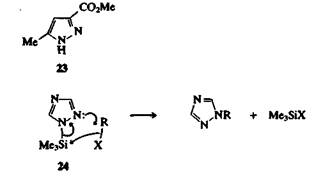 Азолы могут быть проалкилированы по атому азота с помощью разнообразных алкилирующих агентов, но часто бывает трудно предсказать, какой из возможных изомеров образуется. Со- отношение изомеров обычно в значительной степени зависит oт природы алкилирующего агента и условий проведения реакции. На пример, метиловый эфир 5-метилпиразол-З-карбоновой кислоть (23) метилируется диазометаном по атому N-1, а метилиодидом — по атому N-2. Иногда на образование тех или иных соединение оказывают влияние пространственные факторы: например, 4-фенил 1,2,3-триазол метилируется диметилсульфатом по атомам N-1 i N-2, а не N-3. Некоторые N-триметилсилилазолы можно про алкилировать селективно; например, 1-триметилсилил-1,2,4-триазо; (24), который легко получить из 1,2,4-триазола, алкилируется по положению 2. Триметилсилильная группа в ходе реакции отщепляется.