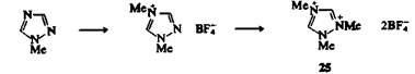 Существует много примеров кватернизации N-замещенных азолов при взаимодействии с алкилирующими агентами. Можно получить даже дичетвертичные соли: например, 1 -метил-1,2,4-триазол успешно метилируется по атомам N-4 и N-2 в избытке тетрафторобората триметилоксония, а соль 25 может быть выделена в виде твердого кристаллического вещества.